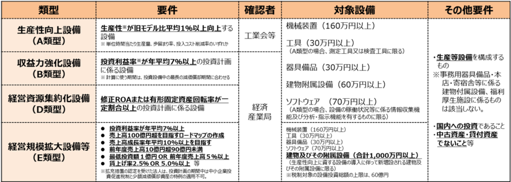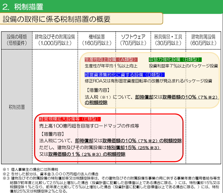 青色申告書を提出する①中小企業者等が、②指定期間定を受けた経営力向上計画に基づき③一定の設備内に、中小企業等経営強化法の認を新規取得等して④指定事業の用に供した場合、即時償却又は取得価額の10%(資本金3,000万円超の法人は7%)の税額控除を選択適用することができます。