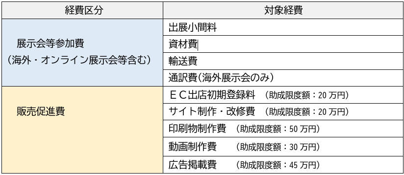 | 印刷物製作費 | 50万円 | 紙媒体の印刷物制作費 ※助成対象期間内に展示会等での配布を行い、助成対象商品をPRする制作物であること |